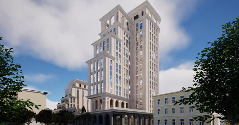 На «Бауманской» только недавно достроили новые корпуса Бауманки, и одно из них — с эффектным круговым полукуполом — уже претендует на статус местной достопримечательности. Тем временем напротив него уже обсуждают строительство нового жилого комплекса. Речь об участке в Гарднеровском переулке, 3. Рендеры опубликовал канал «Недвижимость инсайды». Судя по картинкам, здесь планируют здание в классическом «дорогом московском стиле» из нулевых, но усовершенствованном — с корпусами разной высоты, арками, подобием колонн и обязательными террасами на каждом уступе. Два корпуса на картинках стоят на общем стилобате, а внутри у них нарисован дворик с круглыми клумбами и аккуратными дорожками. Сами дома как будто собраны из нескольких ярусов, каждый из которых немного отступает назад, чтобы освободить место для зелени, и в итоге получается такой ступенчатый пирог с кустами. Отдельное удовольствие — разглядывать верхние этажи: там архитектура становится почти дворцовой, с аркадами и намеком на каки