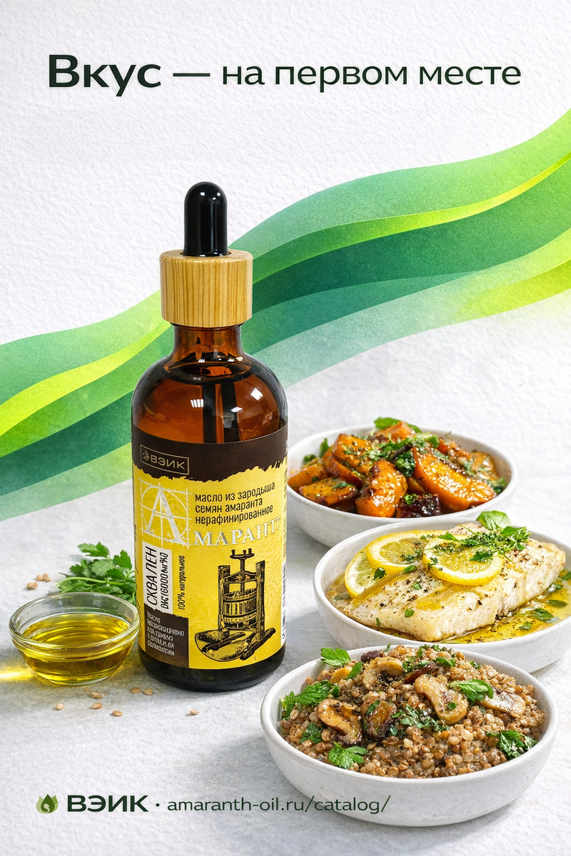 Мы в ВЭИК уверены: хороший продукт не должен жить на кухне как “обязательная полезность”. Если амарантовое масло стоит на полке и ждёт особого случая, значит, ему просто не нашли правильную роль. А правильная роль у деликатного масла чаще всего одна: не жарить, а добавлять в готовое блюдо как финальный штрих.