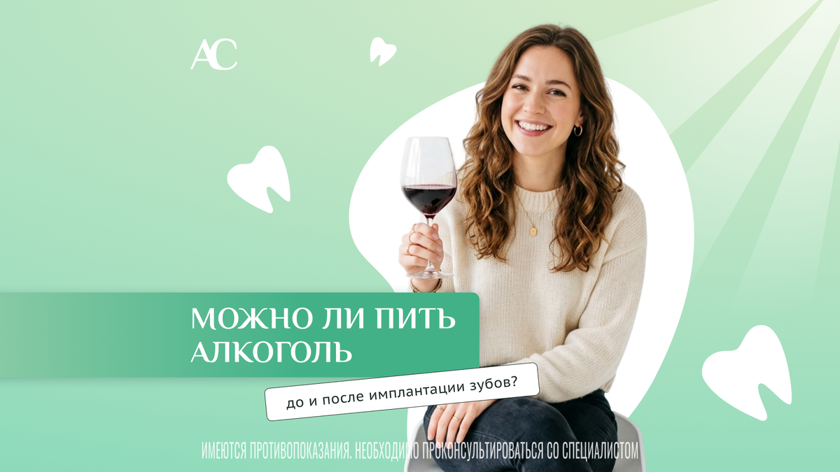 Принятие алкоголя перед операцией может иметь серьёзные последствия ❌ САМОЕ ВАЖНОЕ: Хронический алкоголизм является абсолютным противопоказанием для имплантации зубов! 💡 Алкоголь может негативно повлиять на процесс остеоинтеграции — срастания искусственного корня с костной тканью. Сивушные масла и продукты распада алкоголя разрушают костную ткань, что может привести к увеличению времени приживления импланта или даже к его отторжению. Употребление алкоголя может вызвать воспаление слизистой оболочки в зоне послеоперационной раны. Это приводит к расширению кровеносных сосудов и кровотечению, что замедляет заживление тканей вокруг импланта и повышает риск его отторжения. Можно ли позволить себе немного алкоголя? Даже небольшие дозы алкоголя увеличивают риск осложнений в реабилитационный период. Чтобы минимизировать эти риски, рекомендуется полностью отказаться от употребления алкоголя на рекомендованный срок. ❌ Не стоит полагаться на отзывы людей, которые употребляли алкоголь после импла