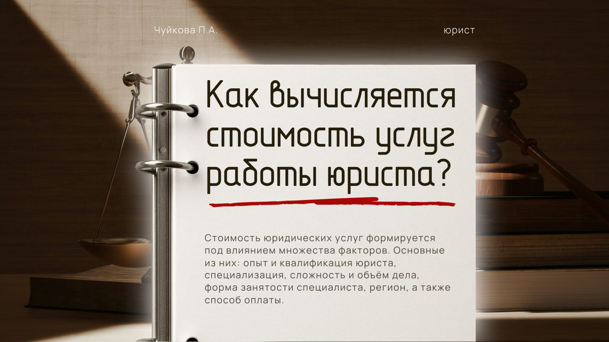 Более опытные юристы с многолетним стажем и успешными кейсами обычно устанавливают более высокие цены. Наличие статуса адвоката также влияет на стоимость услуг: адвокаты, имеющие право работать в уголовной сфере, часто берут больше, чем юристы без такого статуса. Дополнительное образование или сертификация также может повысить стоимость услуг. Юристы работают в разных областях права: уголовное, семейное, корпоративное, гражданское и т. д. Специалисты в узкоспециализированных сферах (например, патентное или международное право) могут устанавливать более высокие расценки из-за ограниченного числа таких экспертов и сложности решаемых задач. Если дело требует большой подготовки, проведения экспертиз, обширных исследований или участия в многочисленных судебных заседаниях, это отразится на стоимости услуг. Некоторые юридические организации при заключении договора указывают количество судебных заседаний, которое входит в стоимость. Если процесс затягивается, дополнительные заседания оплачиваю