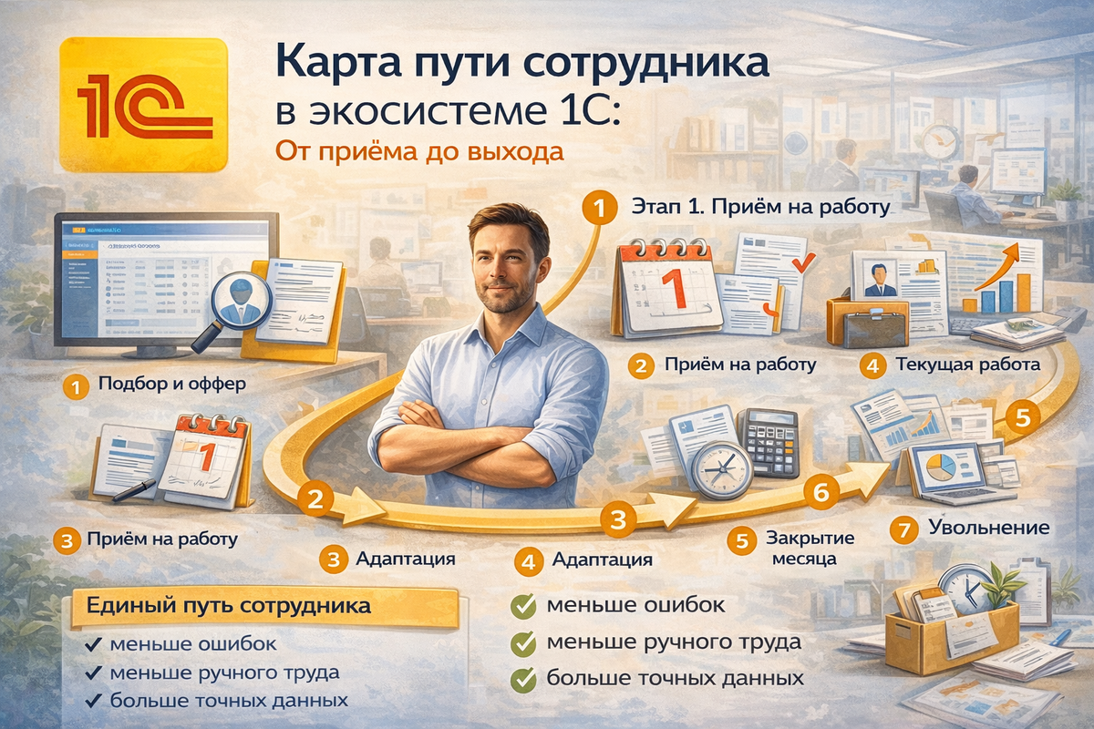 Но если смотреть шире, становится очевидно: ценность — не в отдельных процессах, а в связке всего пути сотрудника. Именно здесь появляется понятие карты пути сотрудника (Employee Journey Map) внутри экосистемы 1С. Это не просто схема этапов. Это: По сути — это жизненный цикл сотрудника, отражённый в системах 1С. Даже если подбор ведётся вне 1С, на этом этапе уже важно: Частая проблема: данные «переезжают» вручную → появляются ошибки уже на старте. Здесь начинается полноценная работа в системе. В 1С:ЗУП фиксируются: Ошибки на этом этапе потом «тянутся» через весь цикл. Формально это не всегда «видимый» этап в 1С,