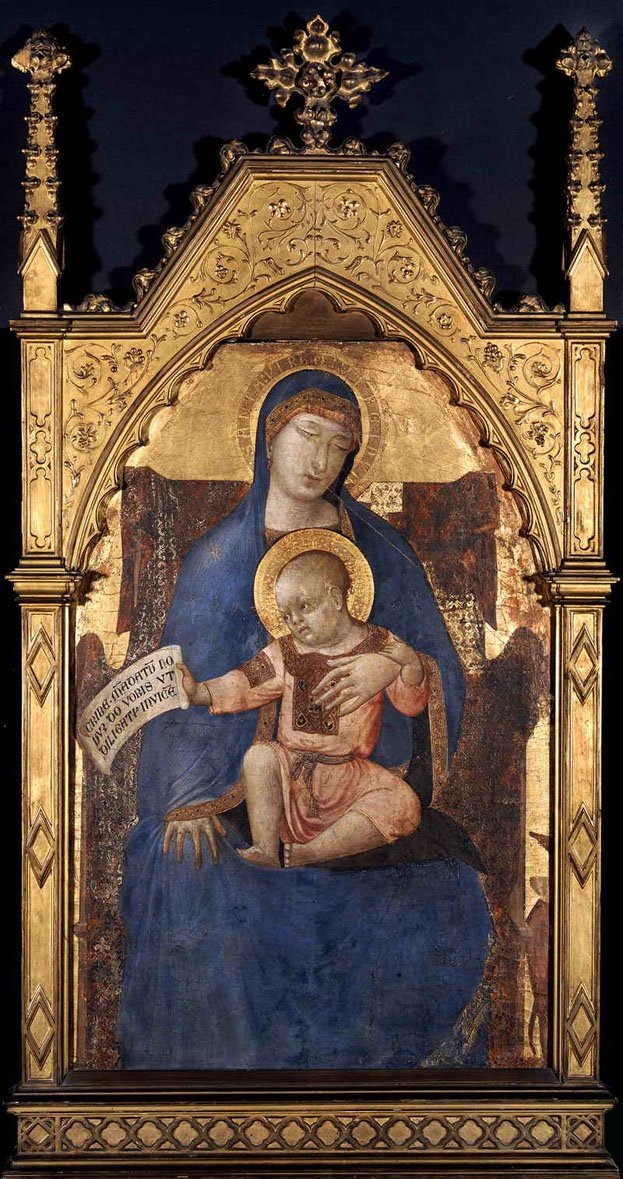 Первая половина XIV века была золотым веком сиенской живописи. Выдающиеся мастера этого периода – Дуччо ди Буонинсенья (ок. 1255/60–1318/19), Симоне Мартини (1284–1344), а также Пьетро (ок. 1280–1348) и Амброджо Лоренцетти (ок. 1290–1348) — заняли ведущее место в европейской живописи благодаря своим революционным, новым композициям, поразительным наблюдениям за природой и беспрецедентным изображениям человеческих фигур. Амброджо Лоренцетти, младший брат Пьетро, постоянно экспериментировал со своими композициями: в этой работе он изобразил две фигуры фронтально, расположив их вдоль центральной вертикальной оси картины. Интенсивный интерес художника к изображению пространства очевиден в смело выполненном ракурсе правой руки Девы Марии и левой ноги Младенца. Эта работа является центральным фрагментом более крупной композиции. Первоначально трон был окружен шестикрылыми серафимами, стражами престола Господня; остатки крыльев одного из серафимов до сих пор видны в правом нижнем углу.