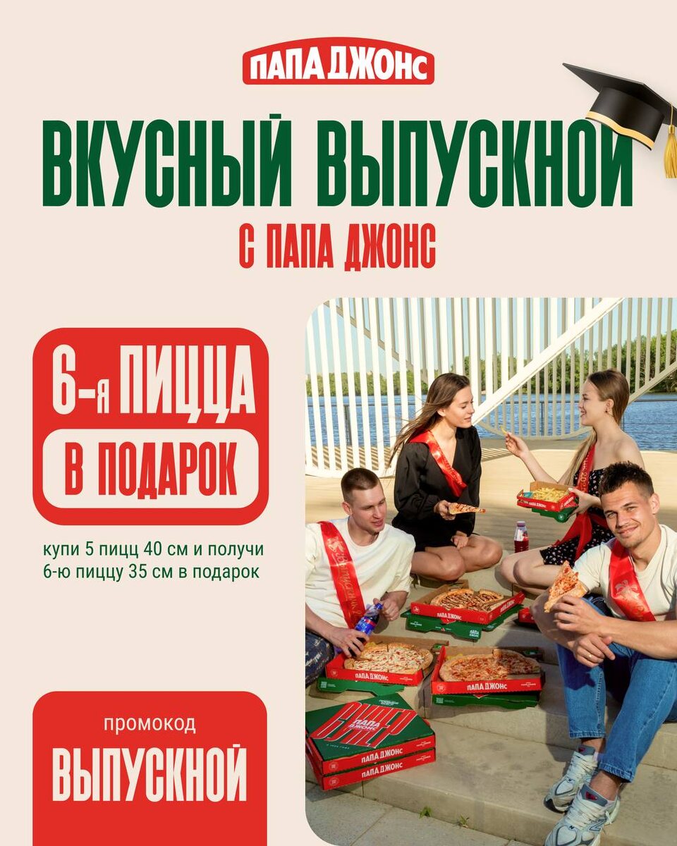 Отмечаете последний звонок с нашей сочной пиццей в подарок🍕 1️⃣ Купи 5 пицц 40см 2️⃣ Вводи промокод ВЫПУСКНОЙ 3️⃣ Получи 6-ю пиццу 35 см в подарок🎁 Жми на корзину и оформляй заказ 🛒