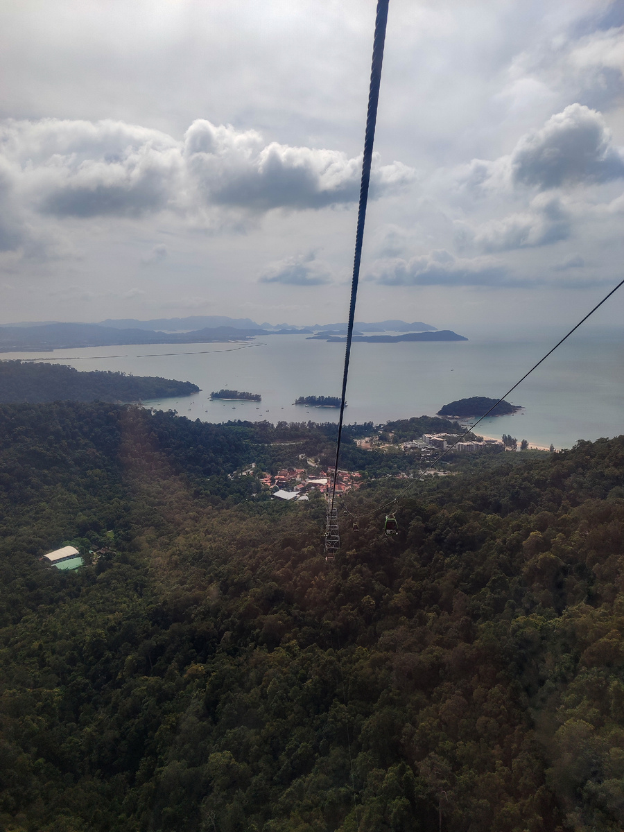 Преодолев первую канатную дорогу мы оказались на смотровой площадке. Это длинна канатная дорога с реально высоким подъёмом, мне было страшновато. Здесь же находится отдельная смотровая "гнездо орла". Поднявшись по второй канатной дороге нас ждут ещё больше смотровых. Две круговые площадки соединенные мостом с замками. Идея создания канатной дороги на острове зародилась в 1999 году благодаря инициативе тогдашнего премьер-министра Махатхира Мохамада. Строительные работы стартовали в апреле 2001 года, и уже через год, в 2002 году, туристы смогли насладиться захватывающими видами с высоты птичьего полета. Выбор конструкции канатной дороги с гондолами был обусловлен ее способностью преодолевать значительные расстояния между опорами, в данном случае – более 900 метров. Система состоит из трех станций. Первая расположена на вершине горы Гунунг Мачинчанг, которая является второй по высоте на Лангкави. Средняя станция получила название "угловая" из-за резкого изменения направления движения кана