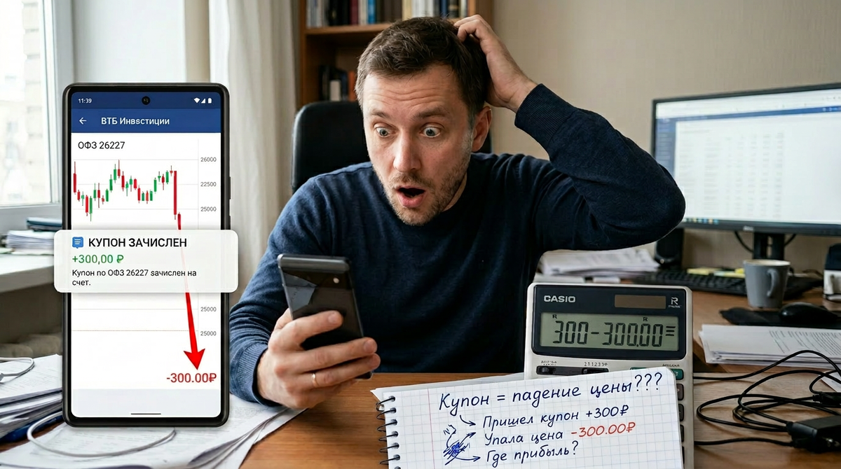Открываю приложение брокера утром, сразу после того, как пришёл купон. На счёте плюс триста рублей, и я уже представляю, как сейчас посмотрю общий результат и порадуюсь простому заработку. Листаю вниз, нахожу свою облигацию и замираю: цена просела ровно на те же триста рублей. Общий баланс на месте, никакого дохода, а в голове одна мысль — меня обманули. Первый порыв — продать всё прямо сейчас, пока не стало ещё хуже. Второй — пересчитать, вдруг ошибка в приложении. Я смотрю на график, пытаюсь понять, что сломалось, и медленно доходит: купон не взялся из воздуха. Я его уже оплатил, когда покупал облигацию за день до выплаты. Месяц назад у меня образовалось пятнадцать тысяч рублей, которые не хотелось класть на вклад: ставка низкая, а снять без потери процентов не получится. Акции пугали резкими колебаниями, поэтому решил попробовать облигации — все говорят, что это проще и спокойнее. Я зашёл в приложение, посмотрел список, выбрал бумагу с ближайшей выплатой купона — буквально на следую