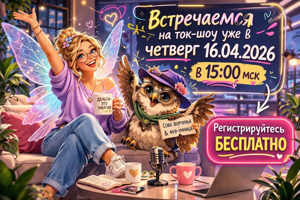 … Продолжение подслушанного диалога На чем мы остановились?! А, точно… Фея-Умница: - И что делать? Опять книжку про финансовую грамотность читать? А какую? Посоветуй! Сова: - Неееет, Умница! Ты уже стопятьсот книжек прочитала! Знаешь всё. Но не летаешь же. В смысле, в деньгах еще не купаешься? Воооот. А у меня всегда запасец припрятан! Не читать надо, а раз-бло-ки-ро-вать. Вытащить этих всадников-вреднятников наружу, посмотреть им в глаза, перестать бояться, стыдиться, винить и терпеть. И тогда деньги – сами придут. Без надрыва. Фея-Умница: - И где этому учат? Сова: - А я вот об этом на бесплатном Ток-шоу с Феей-Умницей и Совой Ворчуньей: «Четыре всадника финансовой немощи: страх, стыд, вина, агрессия» Приходи - и узнаешь, почему ты до сих пор не взлетела и что с этим делать. Фея-Умница: - А мне точно можно? Сова: - Тебе - в первую очередь. И всем, кто устал бояться своих денег. 🎁 Что будет на ток-шоу • Почему деньги не идут, даже если вы всё делаете «правильно». • Ди
