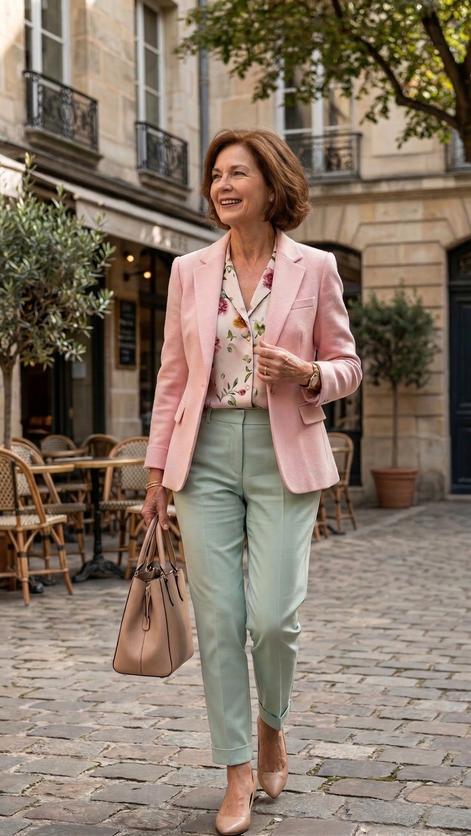 Взгляните на этот образ: мягкий розовый жакет и цветочная блуза работают как естественный рефлектор. Светлый оттенок у лица мягко отражает дневной свет, сглаживает неровности тона и добавляет свежести. Почему это работает: тёплые пастельные оттенки (мятный, персиковый, кремовый) создают эффект «внутреннего свечения», не требуя хайлайтера.