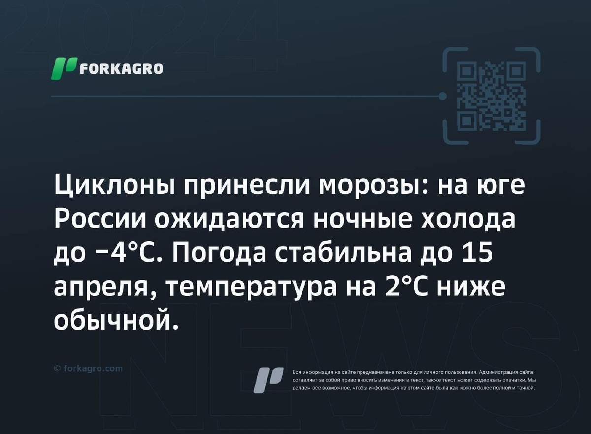 Погода стабильна до 15 апреля, температура на 2°C ниже обычной. По данным РИА Новости, южный район европейской части России подвержен воздействию циклонов, вызывающих ночные морозы. Эксперт из Гидрометцентра Марина Макарова прогнозирует нестабильную погоду до 15 апреля с температурой на 2°C ниже нормы. В Краснодарском крае ночью ожидаются до −4°C. Перейти к источнику
