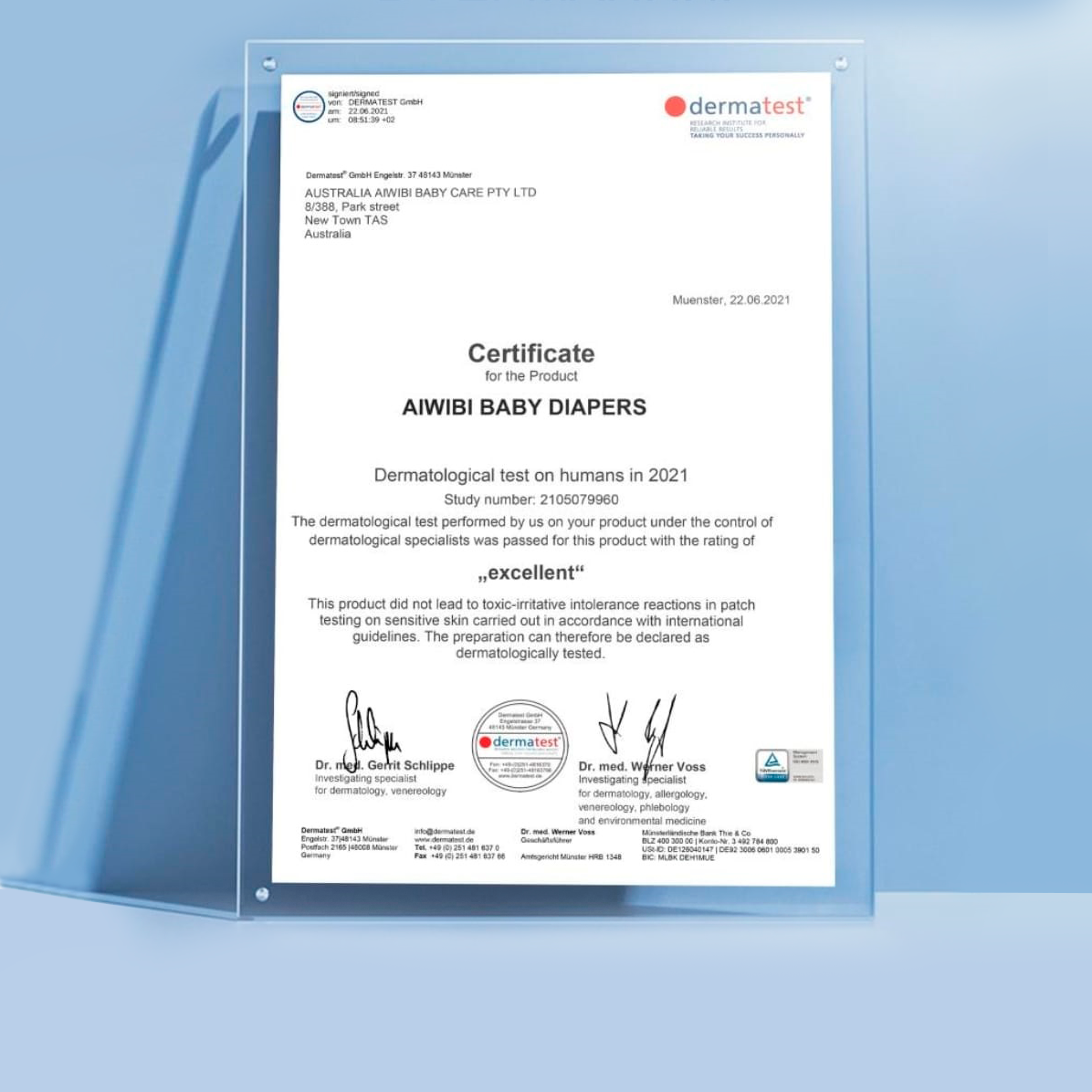 Детские подгузники, трусики и остальные товары AIWIBI прошли клиническое испытание Dermatest в Германии с оценкой "EXCELLENT". Dermatest принимает самые высокие стандарты тестирования качества во всем мире с точки зрения безопасности. Чтобы убедиться, что подгузники и трусики AIWIBI безопасны для нежной кожи ребенка, AIWIBI с 2019 года сотрудничает с институтом Dermatest по тестированию качества. Его сертификация представляет собой гарантию безопасности и надежности продукции для потребителей. Бренд AIWIBI стал одним из немногих брендов детских подгузников, получивших сертификацию Dermatest, что означает, что детские подгузники и трусики AIWIBI являются приятными для кожи и безопасными продуктами, не вызывающими раздражения на коже ребенка.