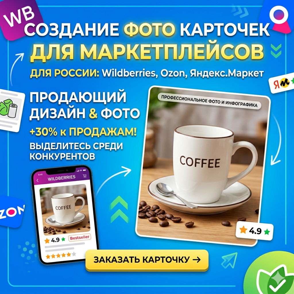 В мире маркетплейсов встречают по одёжке. Если ваше фото не цепляет в первые 2 секунды, покупатель уходит к конкуренту. Но что, если мы скажем, что путь к статусу «Бестселлер» стоит всего 500 рублей? Забудьте о мучительных попытках самостоятельно освоить дизайн или подгнать фото под капризные требования площадок. Мы предлагаем решение «под ключ», которое превратит ваш товар в магнит для заказов. Многие селлеры совершают одну и ту же ошибку: загружают обычное фото на белом фоне, надеясь на чудо. В современных реалиях Wildberries, Ozon и Яндекс.Маркета этого недостаточно. Чтобы выделиться, нужен продающий дизайн, правильная инфографика и акценты на преимуществах. Мы берем всё это на себя: За фиксированную и прозрачную цену вы заказываете полный цикл создания визуала. Наш профессиональный подход гарантирует, что готовый результат превзойдет ожидания. УслугаЧто включеноРезультатКарточка под ключДизайн, текст, ресайзРост конверсииАдаптацияПодгон под требования WB/OzonОдобрение модерациейМар