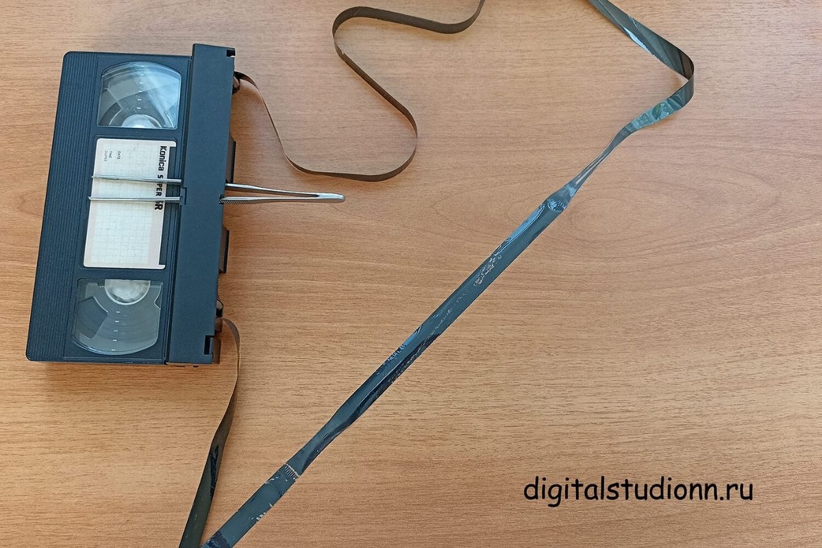 Ремонт видеокассеты, приведение в рабочее состояние перед оцифровкой: удаление испорченного фрагмента магнитной ленты, склейка. VHS, начало 2000-х Об этом: https://digitalstudionn.ru/remont-video-audiokasset