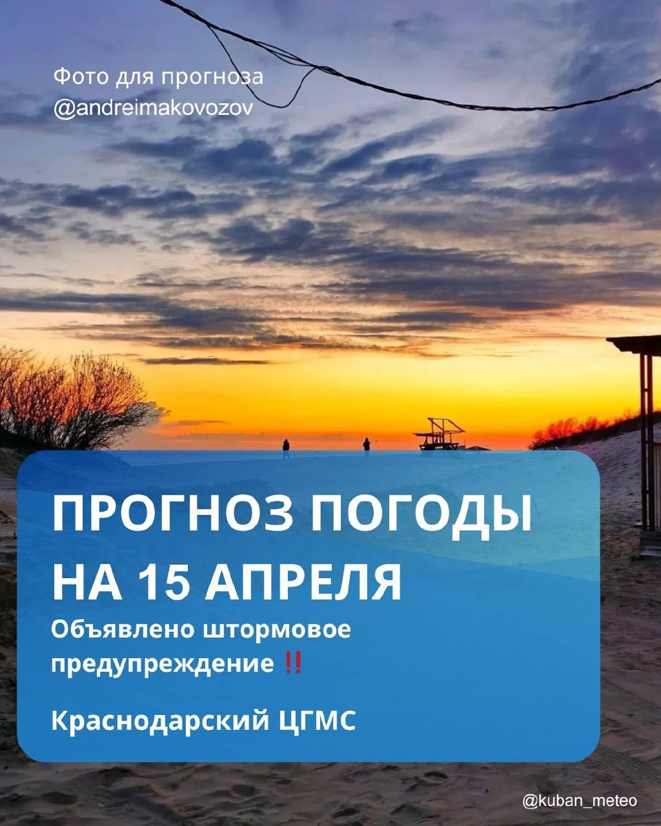 ☁️⛅⛈️ 🌤️Среда, 15 апреля 📍 Краснодарский край Переменная облачность. Ночью местами небольшой дождь, в предгорных районах и в горах мокрый снег❄️снег, днём без осадков. Вечером 14.04 местами кратковременный дождь, в отдельных районах сильный дождь, ливень в сочетании с грозой, градом и сильным ветром с порывами 20 м/с (КМЯ). 💨 Ветер юго-западный, западный 5–10 м/с, местами порывы 12–14 м/с, днём и вечером 15–18 м/с. 🌡 Температура воздуха: ночью 3…8°; ночью и утром местами заморозки в воздухе и на поверхности почвы −1…−4° (ОЯ); днём 13…18°; 🏔 в горах ночью −1…−6°, днём 0…+5°. 🌊 На Черноморском побережье Переменная облачность. Без осадков, лишь вечером местами небольшой дождь. 💨 Ветер юго-западный, западный 6–11 м/с, местами порывы 12–14 м/с, вечером 15–18 м/с. 🌡 Температура воздуха ночью 5…10°, днём 10…15°. 📍 По г. Краснодару Переменная облачность. Без осадков, лишь вечером 14.04 небольшой дождь. 💨 Ветер юго-западный 5–10 м/с, порывы 12–14 м/с. 🌡 Температура воздуха ночью