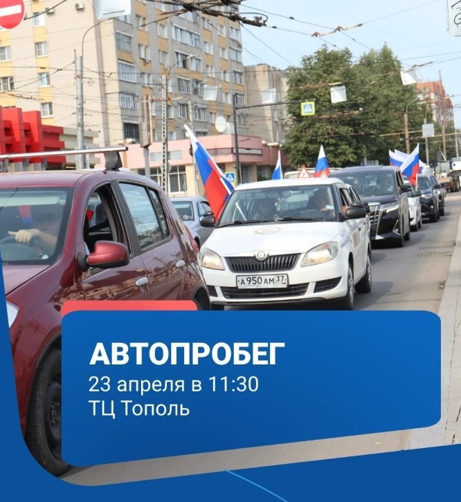 ? В четверг, 23 апреля, в Иванове стартует патриотический автопробег перед «Диктантом Победы». Участвовать может каждый — без ограничений. Колонна соберётся у ТЦ «Тополь» в 11:30, а ровно в полдень двинется к мемориалу Героям фронта и тыла. Финал акции — возложение цветов в знак благодарности поколению победителей. Чтобы присоединиться, заранее отправьте заявку на почту: apr@ivanovo.er.ru.