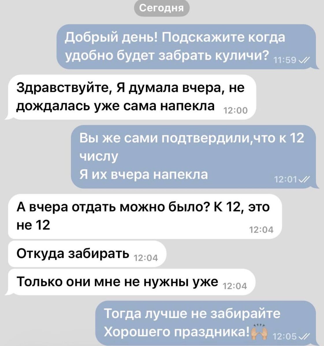 Девушка во время заказа написала, что куличи нужны к 12 апреля, но в итоге она их ждала ДО 12.... В итоге отказалась от заказа". Давайте посмотрим правде глаза. Когда человек заказывает что-то к празднику и ему не написал исполнитель, то он всегда сам напишет и спросит что-где-когда, потому ему нужно получить то, что он заказал. А девушка, видимо, перехотела и решила слиться таким образом." ❓ Если вы слышите фразу «нужны к 12 апреля», до какого именно часа и числа вы бы ждали заказ? ❓ Считаете ли вы, что фраза «к 12 апреля» означает до конца дня 11 апреля или до конца дня 12 апреля? ❓ Какая деталь в переписке могла бы сразу снять это недопонимание? (например, «мне нужно к утру 12-го» или «можно получить 12-го после обеда») ❓ Кто, на ваш взгляд, создал двусмысленность - заказчица или исполнитель? Почему? ❓ Стоило ли исполнителю переспросить: