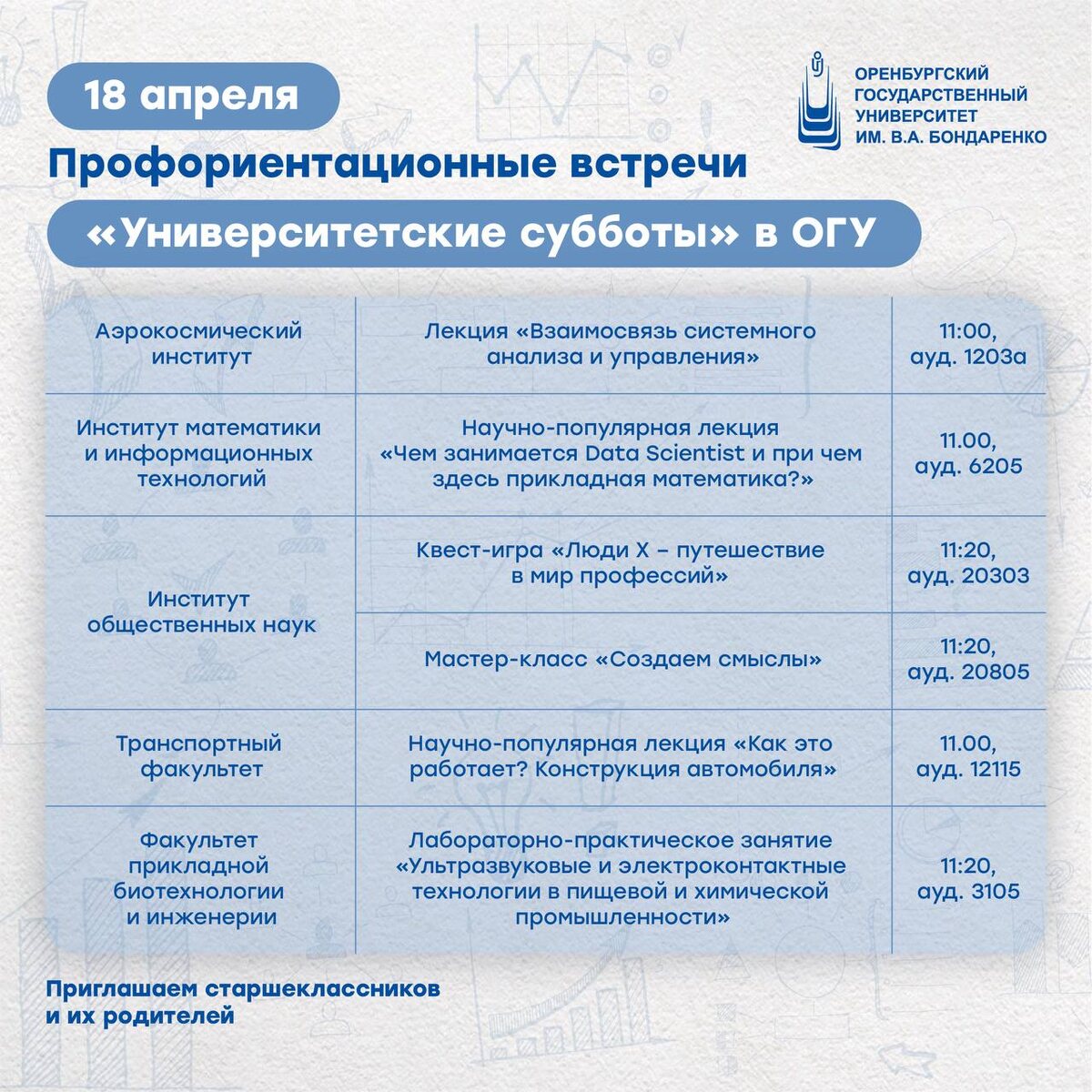 🔥 ОГУ имени В.А. Бондаренко снова открывает двери для школьников и родителей 18 апреля. Приходи, чтобы познакомиться с профессиями, увидеть университет изнутри и понять, какое направление тебе действительно близко! День открытых дверей: ✨ Институт общественных наук – лекция «Психология семьи: почему мы ссоримся с самыми близкими?» 18 апреля в 10:00, аудитория 20718. Университетские субботы: ✨ Аэрокосмический институт – лекция «Взаимосвязь системного анализа и управления» в 11:00, аудитория 1203а; ✨ Институт математики и информационных технологий – лекция «Чем занимается Data Scientist и при чём здесь прикладная математика?» в 11:00, аудитория 6205; ✨ Институт общественных наук – квест-игра «Люди Х — путешествие в мир профессий» в 11:20, аудитория 20303, и мастер-класс «Создаем смыслы» в 11:20, аудитория 20805; ✨ транспортный факультет – лекция «Как это работает? Конструкция автомобиля» в 11:00, аудитория 12115; ✨ факультет прикладной биотехнологии и инженерии – лабораторно-практи