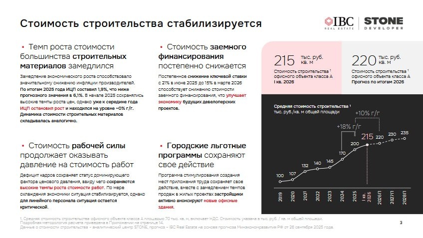 По итогам I квартала 2026 года строительство офисов класса А вышло на уровень 215 тыс. ₽/м², а к концу года показатель может дойти до 220 тыс. ₽/м². ⬇️ Главное изменение — структура давления. Дефицит кадров держит зарплаты высокими (+11% г/г), и именно стоимость работ продолжает тянуть себестоимость вверх. Инфляция производителей в 2025 году просела до 1,9%, и к середине года рост фактически остановился. На этом фоне девелоперы все активнее идут в офисы. 🔵С начала 2025 года заявлено 53 новых проекта, а до 2028 года планируется ввести более 2 млн м² только класса А.