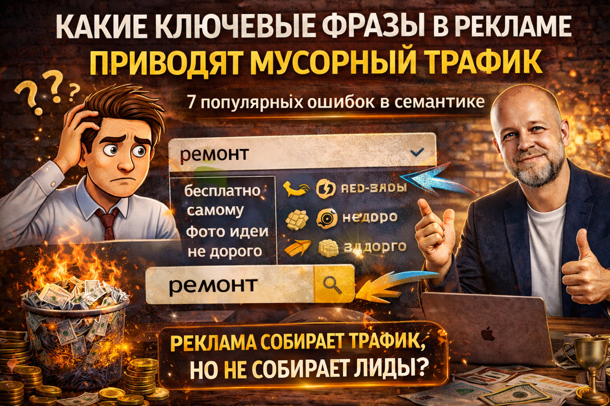 Мусорный трафик в рекламе очень часто начинается не со ставок и не с бюджета, а именно с ключевых фраз.