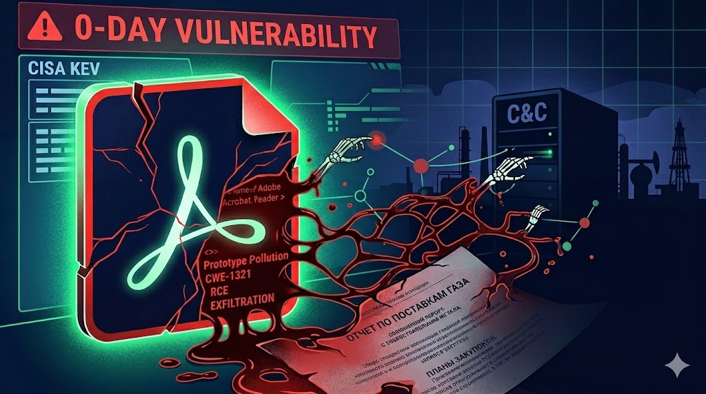 Уязвимость относится к классу Prototype Pollution (CWE-1321), внутри Adobe Reader есть ошибка в обработке JavaScript-объектов. Хакеры встраивают в PDF-файл вредоносный скрипт, который «отравляет» логику программы и заставляет её выполнять команды злоумышленника.