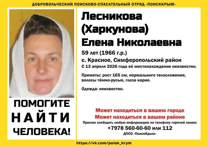 В Крыму третьи сутки ищут 59-летнюю жительницу села Красное Симферопольского района. Елена Лесникова (Харкунова) ушла из дома 13 апреля и не вернулась, её поиски всё ещё продолжаются. Об этом сообщили в добровольческом поисково-спасательном отряде Поиск Крым».