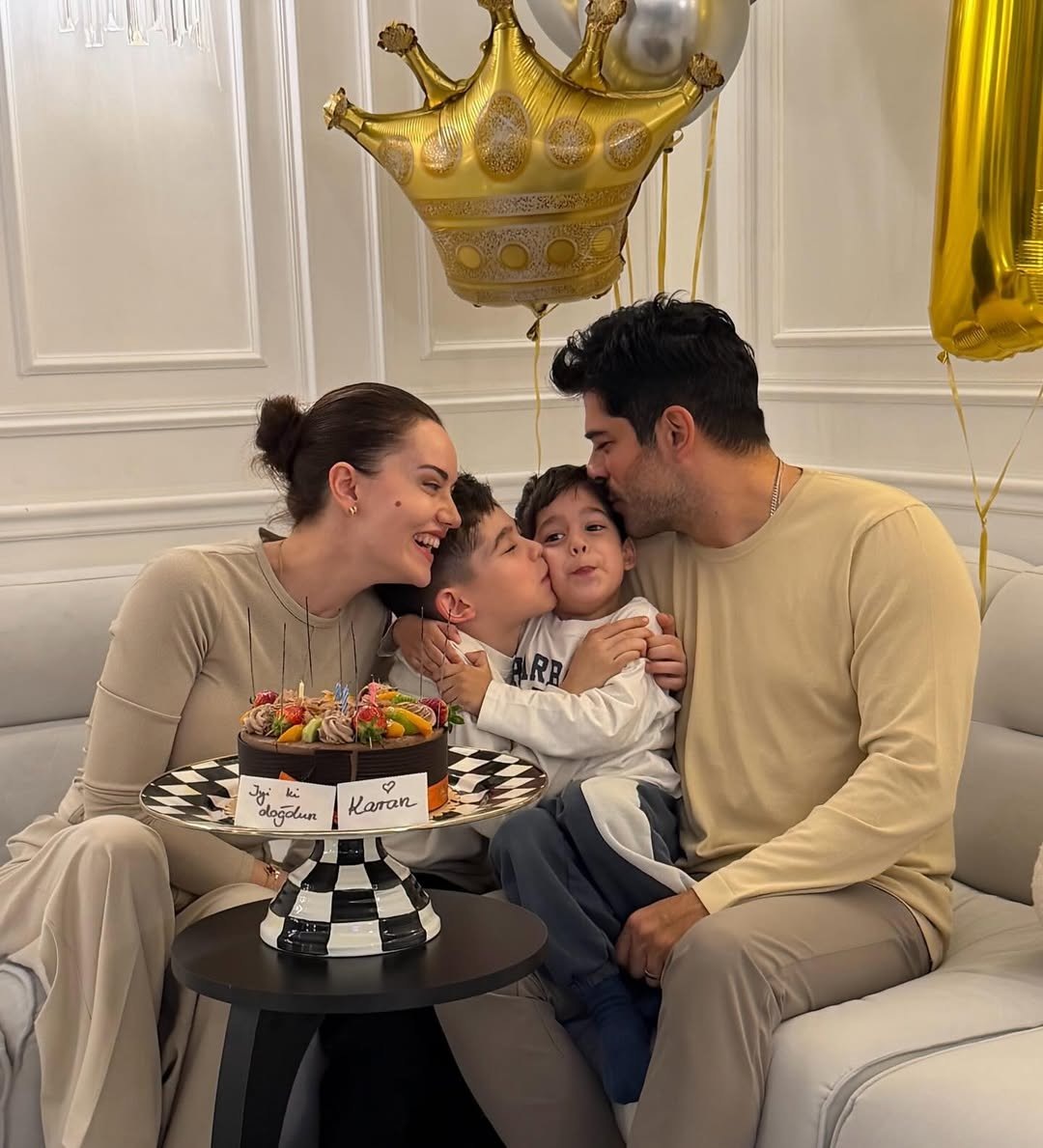 Бурак Озчивит в личном блоге показал редкие семейные фото. 41-летний актер был запечатлен с женой Фахрийе Эвджен и сыновьями – Караном и Керемом. Звезда «Великолепного века» сообщил, что его старший наследник отметил день рождения – 13 апреля Карану исполнилось семь лет. Также супруга турецкого актера показала, какой праздник они организовали для наследника. Актеры собрали друзей Карана, пригласили аниматоров и стилизовали детскую вечеринку под любимую игру малыша. В конце вечера для него приготовили сюрприз в виде трехъярусного торта. «Замечательная семья Озчивит. Поздравляю Карана с днем рождения», «Очень красивые фото, желаем вам счастья», «На этом снимке радостная прекрасная семья, празднующая день рождения своего первенца. Желаю им всего самого наилучшего сегодня и всегда», – писали поклонники. Бурак Озчивит и Фахрийе Эвджен познакомились на съемках сериала «Королек — птичка певчая», в котором они сыграли влюбленных. Однако отношения звезд начались позже. Звезды сблизились на съем