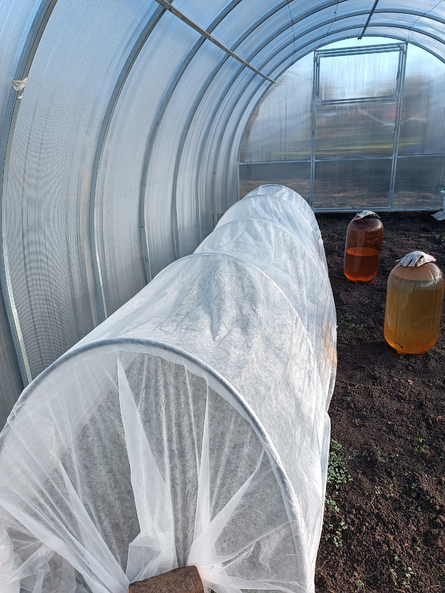 Температура в теплице была на два градуса выше, чем на улице, плюс мы сделали дополнительное укрытие, поставили внутри теплицы небольшой парничок, купленный в Победе за 400 рублей, хлипенький, конечно, но для моей цели вполне подойдёт.
