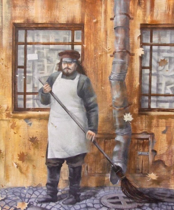Мальчик из интеллигентной семьи, играя в футбол с дворовыми мальчишками, случайно разбивает мячом окно. Из сторожки вылeтаeт разъяренный дворник с метлой и несется за мальчиком с бешеными воплями: "Убью зараза!!!"