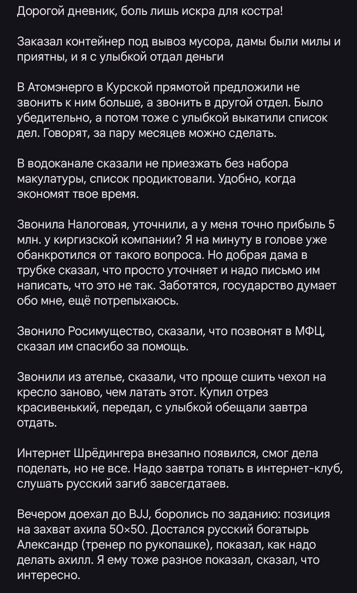 ! Заказал контейнер под вывоз мусора, дамы были милы и приятны, и я с улыбкой отдал деньги В Атомэнерго в Курской прямотой предложили не звонить к ним больше, а звонить в другой отдел. Было убедительно, а потом тоже с улыбкой выкатили список дел. Говорят, за пару месяцев можно сделать. В водоканале сказали не приезжать без набора макулатуры, список продиктовали. Удобно, когда экономят твое время. Звонила Налоговая, уточнили, а у меня точно прибыль 5 млн. у киргизской компании? Я на минуту в голове уже обанкротился от такого вопроса. Но добрая дама в трубке сказал, что просто уточняет и надо письмо им написать, что это не так. Заботятся, государство думает обо мне, ещё потрепыхаюсь. Звонило Росимущество, сказали, что позвонят в МФЦ, сказал им спасибо за помощь. Звонили из ателье, сказали, что проще сшить чехол на кресло заново, чем латать этот. Купил отрез красивенький, передал, с улыбкой обещали завтра отдать. Интернет Шрёдингера внезапно появился, смог дела поделать, но не все