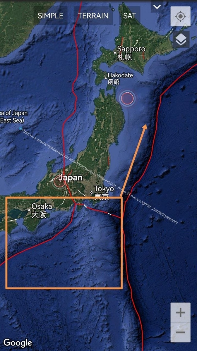 В течение 9 дней здесь есть вероятность землетрясения М6 и выше. ===== To the northeast of Honshu, a cloud projection shifted towards Hokkaido from the northern boundary of the Philippine Plate. There is a possibility of an earthquake of M6 and higher within 9 days.