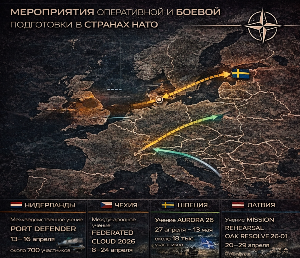 В Нидерландах в период с 13 по 16 апреля проводится межведомственное учение Port Defender, ориентированное на защиту портовой и морской критической инфраструктуры. Основной район проведения охватывает Роттердам, прилегающие морские акватории и инфраструктуру в зоне ответственности структур безопасности Роттердам-Рейнмонд и Зеландии. К мероприятию привлечены силы обороны, полиции, береговой охраны и гражданские службы реагирования. В ходе учения отрабатываются действия по обеспечению безопасности порта, восстановлению его функционирования после условных кризисных инцидентов, освобождению заложников, эвакуации, защите морских объектов и реагированию на угрозы в акватории и на прибрежной инфраструктуре. В Чехии с 8 по 24 апреля проходит международное учение Federated Cloud 2026, предназначенное для практической проверки устойчивости систем связи, управления, обмена данными и радиоэлектронного противоборства в условиях, максимально приближенных к кризисной и боевой обстановке. В учении уча
