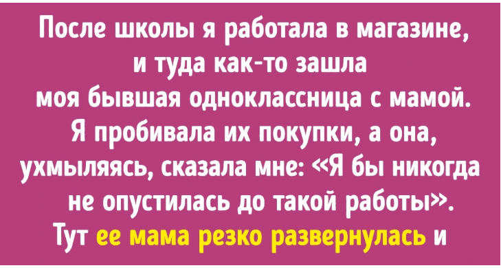 После выпускного я подрабатывала в местном супермаркете, а она как-то зашла туда с мамой купить продуктов. Все время, что я пробивала их покупки, она стояла и ухмылялась, разглядывая меня. А потом сказала: «Не могу поверить, что ты работаешь здесь. Я бы никогда в жизни не опустилась до такой работы». Я не успела ничего ответить, потому что ее мама резко развернулась и сказала ей: «Ты, наверное, думаешь, что слишком хороша, чтобы работать? Да тебе надо сильно постараться, чтобы стать хоть вполовину такой же сознательной и независимой, как эта девушка!»