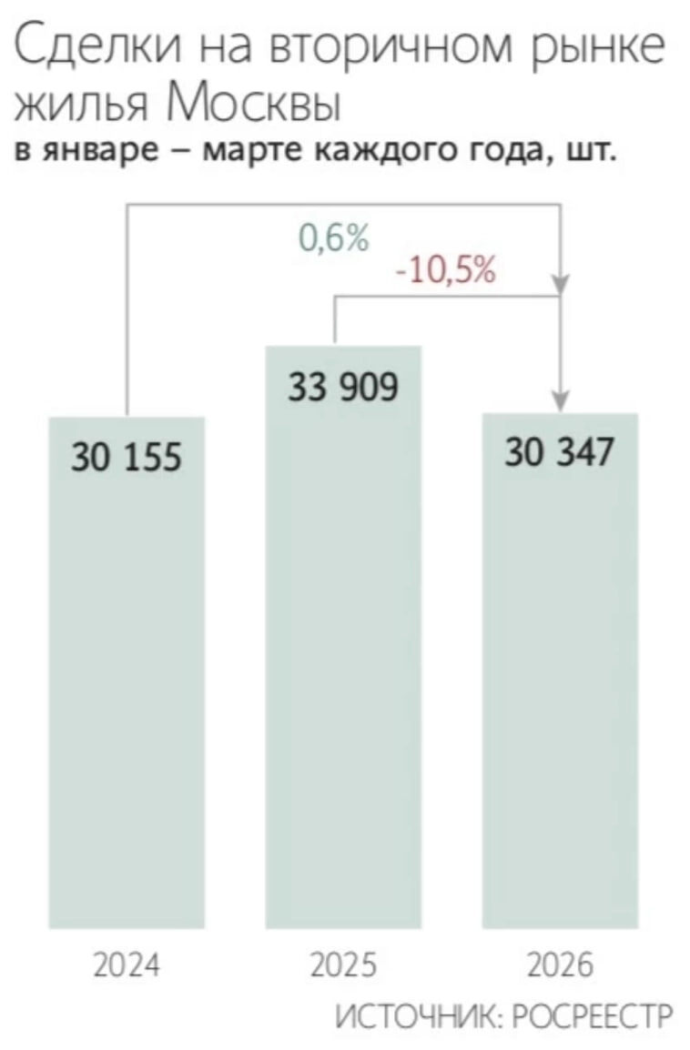 За I квартал в Москве зарегистрировано 30,3 тыс. сделок — это на 10,5% меньше год к году, при том что средние ставки по вторичке снизились почти на 9 п.п. — с 28,6% до 20%. К марту рынок начал восстанавливаться: число сделок выросло до 12,1 тыс. (+12% к февралю и +1,9% г/г). 🔵 Риелторы отмечают, что часть покупателей вернулась со стороны первичного рынка, где сдерживающими факторами остаются дорогая рыночная ипотека и разрыв цен между строящимся и готовым жильём.