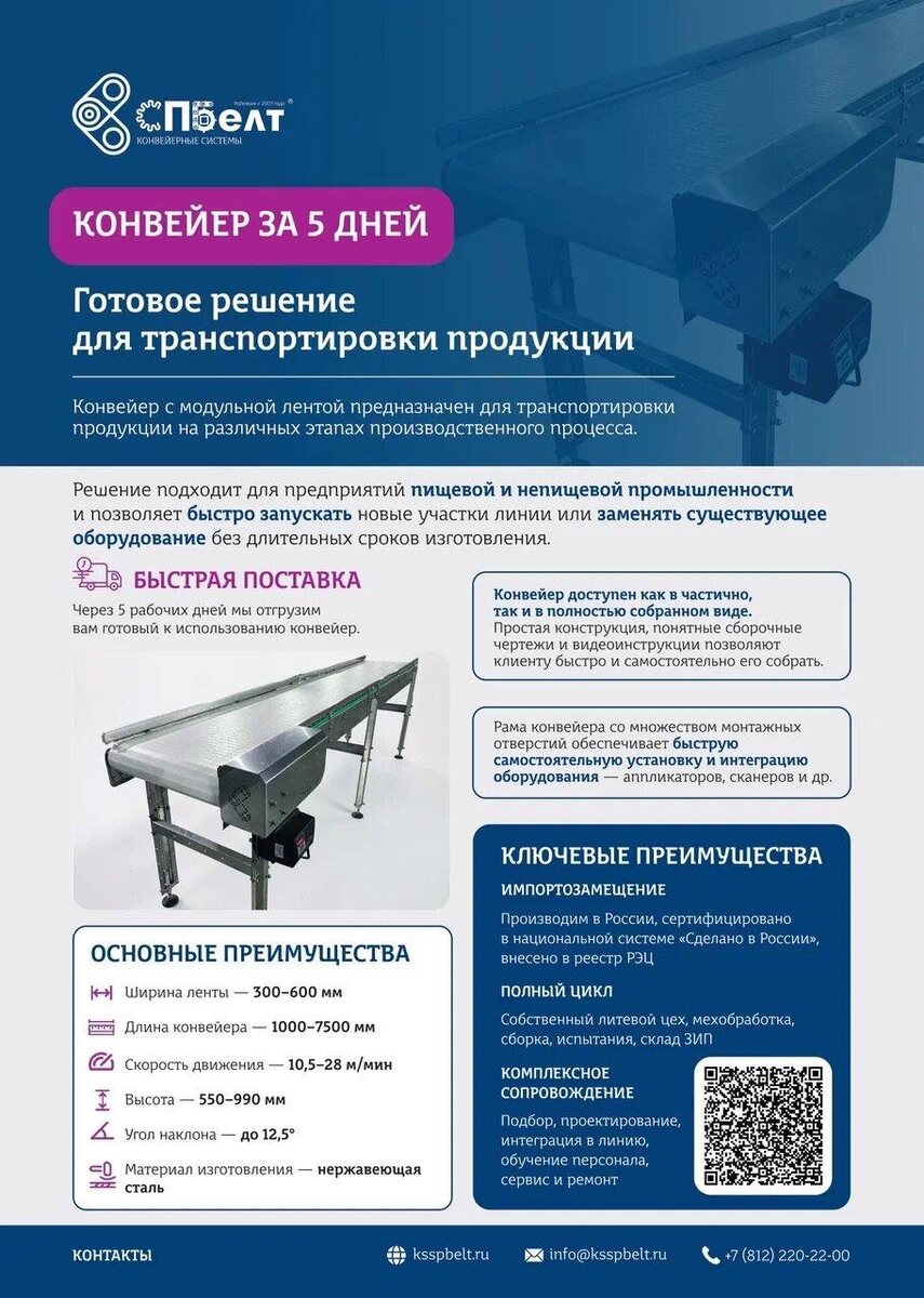 Если нужно быстро, мы делаем быстро. Готовое решение на модульной ленте, которое уже через 5 рабочих дней будет у вас на производстве и адаптировано к работе. Без долгого проектирования и сложного внедрения. Подходит для пищевых и непищевых производств. Конвейер легко встраивается в существующую линию. Можно доукомплектовать датчиками, сканерами и другим оборудованием без доработок. Сокращайте время запуска вместе с СПБелт.