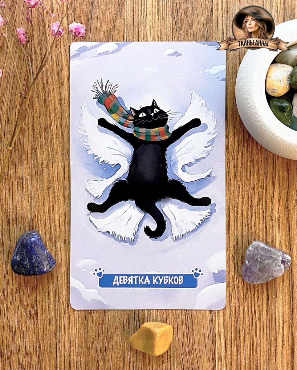 » На карте — чёрная кошка, раскинувшая лапы в снегу и делающая «снежного ангела». По всей видимости, вы неплохо потрудились, «кубки достижений» выстроены в ряд, урожай собран, результаты налицо — и сейчас от вас требуется одно: перестать суетиться и позволить себе какую-нибудь «восхитительную ерунду». «Стандартная» Девятка Кубков — это карта исполненных желаний, устойчивости и довольства... а вам надо просто выдохнуть. Без вашего вмешательства ничего не развалится, дела подождут, а вам можно просто прилечь и отдохнуть... То, что сегодня можно и нужно делать: ◈ Заниматься чем-то бесполезным и приятным без вины. ◈ Встретиться с друзьями, устроить спонтанные посиделки. ◈ Побаловать себя вкусной едой, покупкой или прогулкой. ◈ Принимать комплименты и подарки судьбы с благодарностью. ◈ Посмеяться над собой и не относиться к жизни слишком серьёзно. То, чего делать сегодня не следует: ◈ Браться за новые проекты и важные решения. ◈ Мучить себя чувством вины за «потраченное впустую» время.