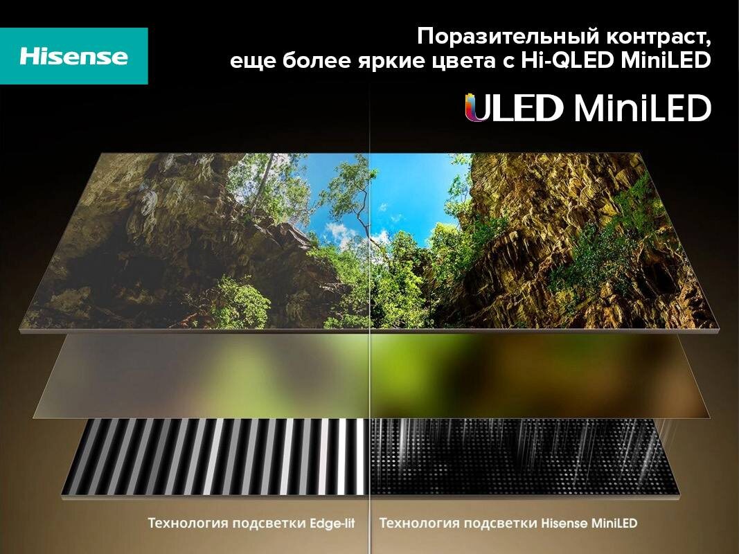 ! 🔥 Подсветка Hi-QLED MiniLED выводит качество картинки на новый уровень! — Черный становится более глубоким — Другие цвета более насыщенными и яркими — Высокая детализация даже в самых сложных сценах Вы получите на 30% больше оттенков, чем от телевизора со стандартной LED-подсветкой ✨ Теперь не важно, что на экране, каждая деталь остаётся чёткой, а картинка выразительной, даже при дневном свете. Независимо от жанра, будь то кинематографичная драма, напряжённый спортивный матч или динамичная видеоигра — картинка остаётся чёткой, выразительной и реалистичной даже при дневном освещении 🎬