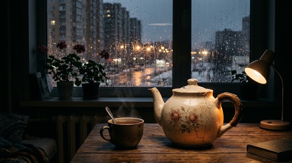Людмила встаёт, чтобы налить ещё чаю. Из чайника с розами. Того самого. Чайник старый, потрескавшийся, с отбитой ручкой, которую Людмила подклеила суперклеем прошлой зимой. Он некрасивый. Нелепый. Чужой.