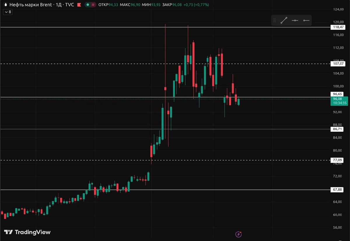 : Не закрылись ниже 2708пт. Постоянно выкупают. Очень хорошо. Возможно, поход на 2800 увидим. Шорты открывать нельзя. Если есть, то только со стопом. Структуру пробивали, но подтверждения еще не было. Доллар-рубль на днях: Пришли на 75,1пт. В данный момент уровень дает реакцию на цену. Очень хорошо. Можем вернуться на 77пт. Нефть: Прошли ниже 96пт. Пока стоим там. Этот уровень не отпускает актив. Наблюдаю. Каких-то действий лучше не совершать, так как ничо не понятно.