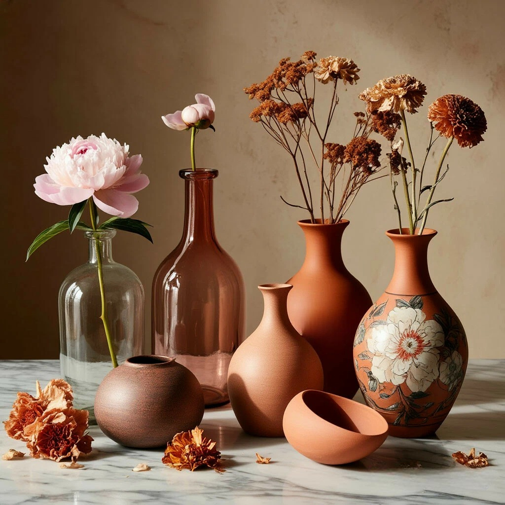 Керамические вазы также разнообразны. Глазурованные имеют гладкую блестящую поверхность и яркие цвета, они легки в уходе. Терракотовые — шероховатые, матовые, натуральных тонов, идеальны для экостиля, кантри и бохо. С рельефом — с лепниной, оттисками, фактурной поверхностью — создают игру света и тени. Керамические вазы часто имеют «ручной» характер: следы лепки, неровности, авторские глазури.
