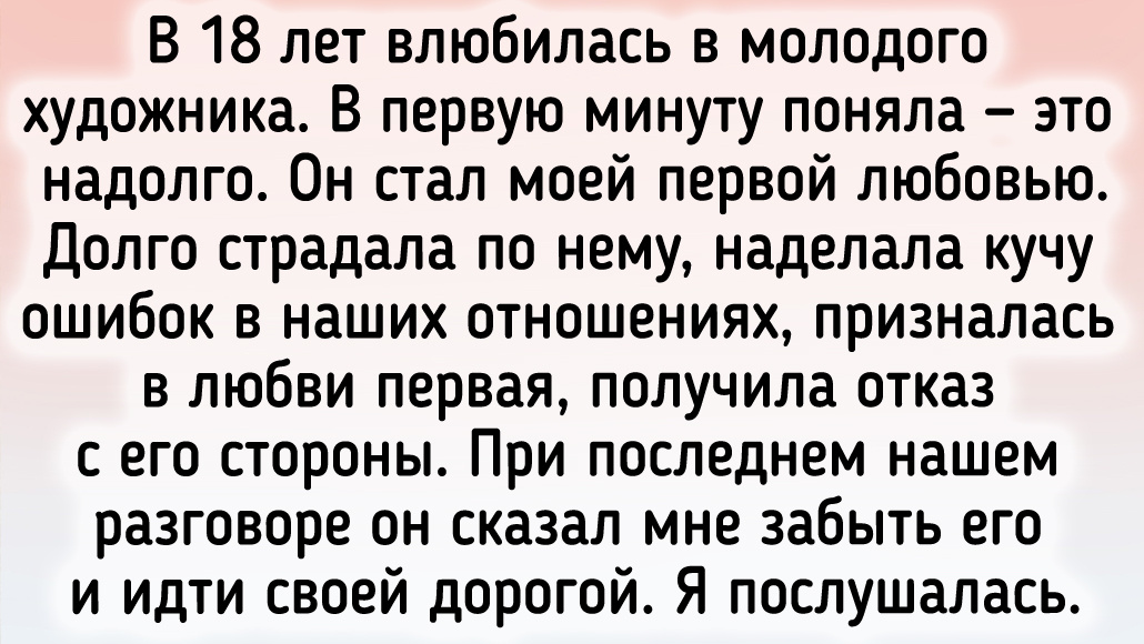Многие считают, что первая любовь самая искренняя и особенная. Для кого-то она становится лишь воспоминаниями, а другим удается построить долгие и серьезные отношения. Так или иначе, к историям о первых бабочках в животе невозможно относиться равнодушно. В 18 лет влюбилась в молодого художника. В первую минуту поняла — это надолго. Он стал моей первой любовью. Долго страдала по нему, наделала кучу ошибок в наших отношениях, призналась в любви первая, получила отказ с его стороны. При последнем нашем разговоре он сказал мне забыть его и идти своей дорогой. Я послушалась. Вскоре вышла замуж. Родила. Сейчас с момента нашей первой встречи с тем художником прошло 11 лет. Недавно узнала, где он, увидела фотографию. Он очень изменился. От того милого лица не осталось и следа. Постарел, полысел, но все равно села и расплакалась — не забыла. Так же бешено стучит сердце. Все так же люблю. А он про меня наверняка уже и забыл. Ехала в поезде. Обедала в вагоне-ресторане, ко мне подсел парень. Вел с