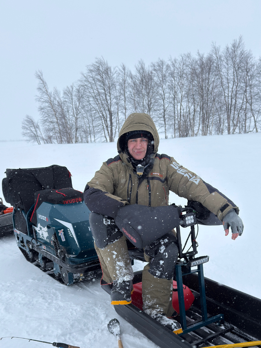 Мой iKUDZO Terrain 1500/600 быстро и уверенно набрал максимальную скорость. Я даже не заметил, как отдалился от друга. А где-то посередине озера наст стал ещё более покатым, и меня начало так подбрасывать, что я еле-еле усидел в кресле. Сбавил газ, остановился, смотрю назад — а Жора уже превратился в небольшую точку среди белой пелены.