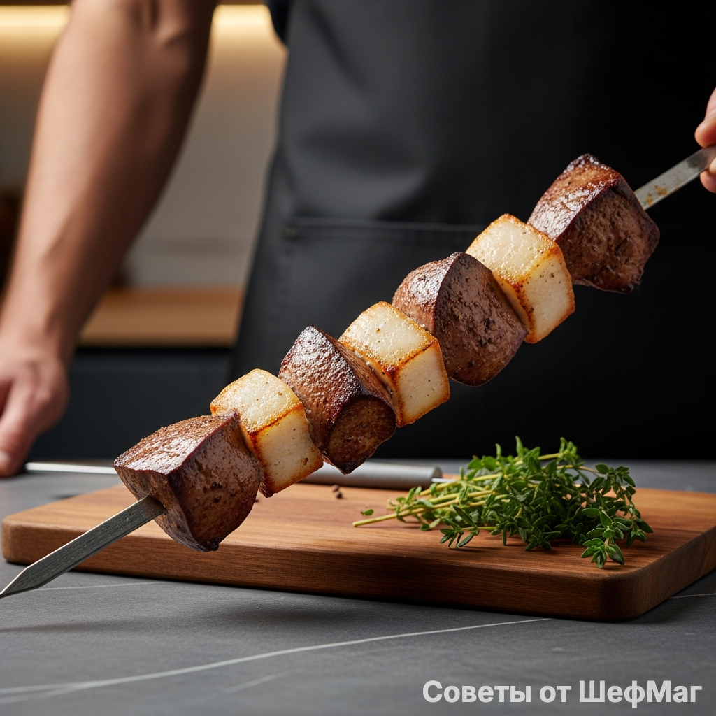 Привет, друзья! Говяжья печень на углях - это невероятный деликатес, но многие боятся его готовить. Одно неверное движение, и вместо нежнейшего блюда вы получаете жесткую «подошву» с легкой горчинкой. Сегодня мы разберем технику, которая превращает обычную печень в сочный шедевр. Секрет кроется в правильной подготовке и идеальном компаньоне на шампуре. 🥩 Говяжья (или телячья) печень - 600 г; 🥓 Курдючный жир (или свежее свиное сало) - 200 г; 🥛 Молоко (для вымачивания) - 200 мл; 🌿 Молотый кориандр и зира - по 1/2 ч. л.; 🧂 Крупная соль и свежемолотый черный перец - по вкусу. КБЖУ на 100 г: Калории - 185 ккал, Белки - 14.5 г, Жиры - 13.2 г, Углеводы - 1.5 г. Печень - это фильтр организма, пронизанный желчными протоками. Замачивание в молоке творит чудеса: молочная кислота и кальций разрушают остатки горечи и размягчают волокна. А добавление курдюка или сала на шампур защищает нежную текстуру от жара углей. Плавящийся жир постоянно обволакивает печень, не давая влаге испариться. 1. Очи