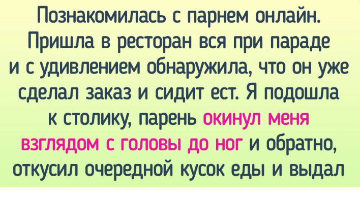 - Познакомилась с парнем онлайн. Пришла в ресторан вся при параде и с удивлением обнаружила, что он уже сделал заказ и сидит ест. Я подошла к столику, парень окинул меня взглядом с головы до ног и обратно, откусил очередной кусок еды и выдал: «Нет». Я стояла в абсолютной растерянности, а он, раздраженный тем, что я еще не ушла, небрежно добавил: «Извини, я ищу кого-нибудь покрасивее». После чего я просто развернулась и ушла, но ощущения были отвратительные.