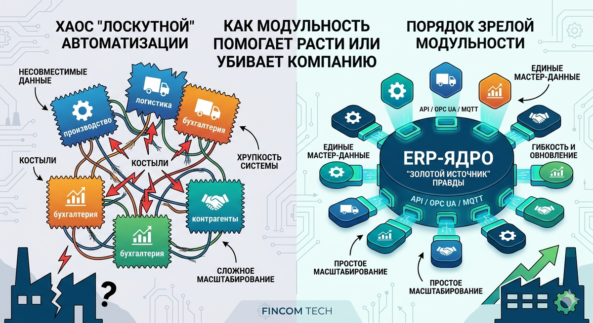 Бессистемная закупка лучших ИТ-решений приводит к параличу управления, когда данные в разных отделах противоречат друг другу. Правильная модульность — это не набор случайных инструментов, а строгая иерархия, где ERP-ядро выступает фундаментом, а периферийные сервисы подключаются по единым правилам. Если каждый цех выбирает софт на свой вкус, компания получает «лоскутное одеяло», которое рвется при малейшей попытке масштабирования. Представьте завод как оркестр. Модульность в здоровом понимании — это когда у каждого музыканта есть своя партитура, но все они смотрят на одного дирижера и настроены в одной тональности. Лоскутная автоматизация — это когда скрипач играет джаз, барабанщик бьет марш, а дирижер пытается собрать из этого симфонию, перекрикивая шум. Инструменты по отдельности могут быть профессиональными и дорогими, но музыки не получится. Анатомия «лоскутного» хаоса Обычно всё начинается из благих побуждений. Производству нужен мониторинг станков, логистам — оптимизация маршрут