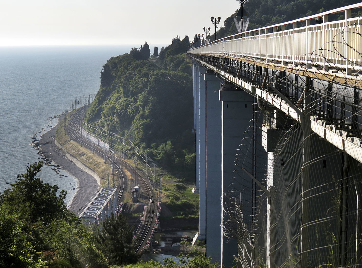 На Черноморском побережье Кавказа, за посёлком Чемитоквадже между Сочи и Лазаревским, над Зубовой Щелью протянутся на 576 метров самый высокий (по полотну) мост всей России - 83 метра до реки! Построенный в 1989-99 годах, он явно должен был стать первым в цепочке таких мостов - трасса вдоль побережья, прыгая по склонам, на карте напоминает расчёску или хотя бы пилу, выписывая параболу в каждом ущелье. Спрямить её можно было только так: единственный ровный путь вдоль берега уже был занят железной дорогой. На неё отсюда смотришь вертикально сверху: Внизу поезд идёт: Вид дальше в сторону Сочи, вдали заметен тоннель с редким здесь старым порталом. На самом деле их от Туапсе до Адлера всего 8, но по ощущениям - десятки, как на Кругобайкалке. Высадившись за мостом (чуть ближе к Сочи), мы прошли его пешком в две стороны, стараясь держаться в противофазе с одиноким охранником. 3 года назад (когда мы здесь были) вопросы бдительности ещё не стояли так остро... Под мостом, вдоль речки Чемитоквад