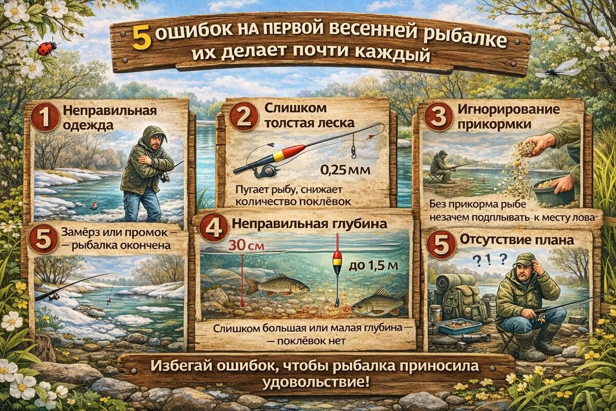 Первая весенняя рыбалка — всегда особенное событие. Солнце светит ярко, лёд сходит, и кажется, что рыба сама плывёт в руки. Но реальность часто оказывается другой. Мы собрали 5 самых частых ошибок, которые допускают рыбаки в апреле, чтобы вы их точно не повторяли. Весной вода холодная, рыба вялая и осторожная. Многие берут крупные или яркие приманки, думая, что это ускорит поклёвку. Совет: выбирайте мелкие, натуральные по цвету приманки. Медленная проводка — ваш лучший друг. После зимы леска может потерять прочность, катушка — смазку, удилище — кольца. Новички часто не проверяют снасти и теряют рыбу на первой поклёвке. Совет: перед выездом обязательно проверьте всё — особенно леску и крючки. Весной погода обманчива. Солнце может греть днём, но вода и утро холодные. Многие приходят в лёгких куртках и замерзают, теряя удовольствие от рыбалки. Совет: всегда берите слой тёплой одежды и непромокаемую куртку. Весной дороги и тропы к водоёму могут быть размыты, а любимое место — ещё замерзше
