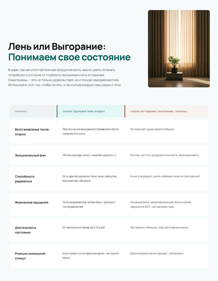 Теория — это хорошо, но на практике нам нужен простой и понятный инструмент самодиагностики. Давайте честно: иногда мы действительно просто ленимся. Не потому, что устали, а потому, что не хотим делать скучную работу, идти на неинтересную встречу, мыть посуду, заполнять дурацкую отчётность. И это нормально. Человек имеет право не хотеть. Более того, здоровая лень — это признак того, что вы не робот и не трудоголик. Но как отличить здоровую лень («полежу полчасика и встану, просто не хочется») от патологического истощения («лежу уже месяц, жить не хочется, ничего не радует»)? Вот таблица маркеров, которую я использую в консультациях. Если у вас преобладают признаки правого столбца — это не лень. Это сигнал SOS. И лечить его нужно не самодисциплиной, не «взять себя в руки», а отдыхом, врачами (терапевт, эндокринолог, невролог, психиатр), терапией и снижением нагрузки. Чем раньше вы это признаете, тем быстрее вернётесь к жизни. Если же вы в левом столбце — расслабьтесь. Вы имеете право по