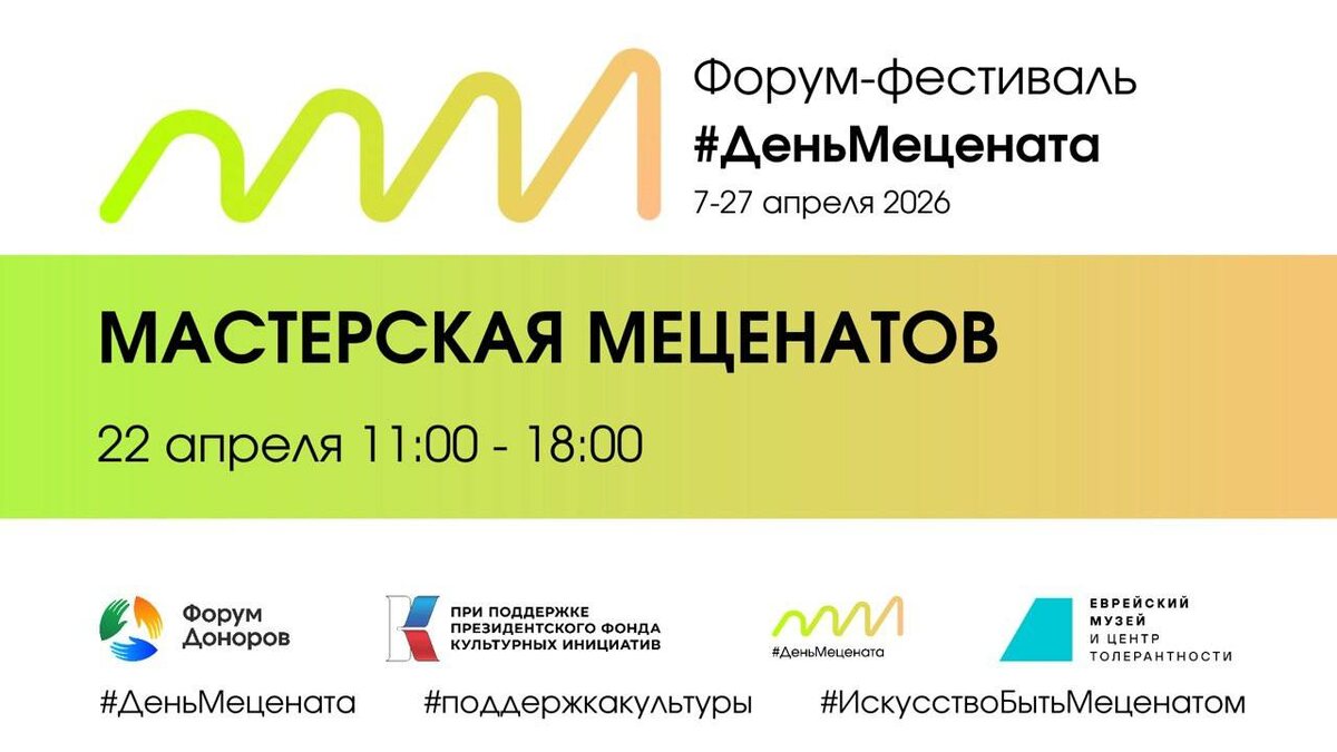 Форум Доноров приглашает вас стать частью Мастерской меценатов - серии практических сессий, где встречаются представители учреждений культуры, бизнеса, фондов и государства, которая пройдет в рамках II Форума-фестиваля #ДеньМецената. Это не просто программа — это пространство для диалога, в котором рождаются идеи, партнёрства и новые форматы взаимодействия. 22 апреля вас ждёт насыщенная и структурированная программа: 🔹 Стратегическое осмысление культуры - «Культурные стратегии» — о том, как сегодня культурные институции планируют будущее и трансформируют подходы к развитию. 🔹 Роль меценатства и инвестиции в культуру - «Новый взгляд на место меценатства в российском обществе: усовершенствование системы» - «Культурная институция как стратегическая инвестиция: от разовой поддержки к управлению ценностью» 🔹 Партнёрства и коллаборации - «Культура +» — открытые диалоги о реализованных проектах и успешных кейсах взаимодействия. 🔹 Практика и инструменты - Питчинг культурных проектов — во