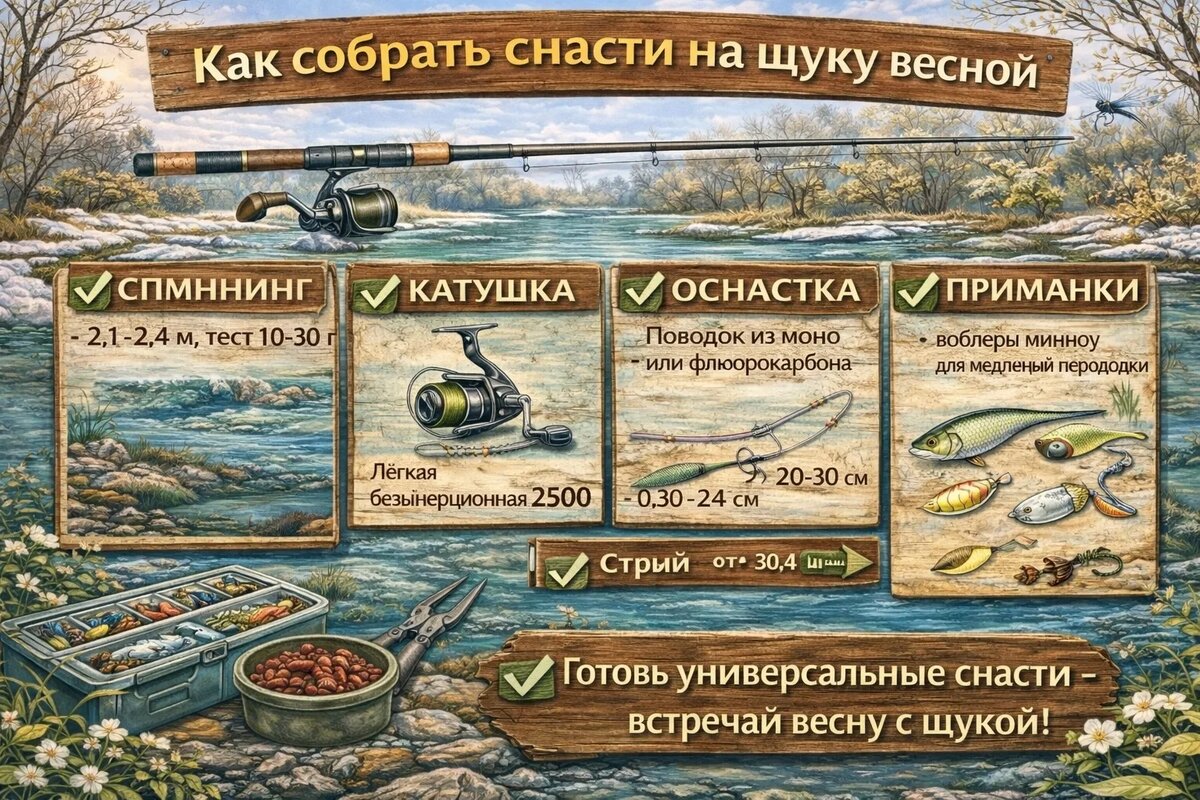 Весна — время осторожной щуки, и чтобы первый выезд на воду был успешным, важно правильно собрать снасть. Даже небольшие ошибки могут испортить улов. Давайте разберём пошаговую сборку весенней снасти на щуку. • Удилище: 2,1–2,7 м, средний тест 5–20 г. • Катушка: безынерционная, средний размер. • Совет: перед рыбалкой проверьте катушку на плавность вращения и лёгкость сматывания лески. • Леска: 0,18–0,25 мм или плетёный шнур 0,10–0,15 мм. • Поводок: стальной или флюорокарбоновый — щука любит «покусывать». • Совет: поводок делайте длиной 20–30 см для защиты от зубастой рыбы. Весной щука осторожна, поэтому лучше: • силиконовые твистеры или виброхвосты 3–5 см • джиг-головки 5–12 г • мини-воблеры суспендеры Совет: выбирайте натуральные цвета и медленную проводку. 1. Привяжите леску к катушке. 2. Присоедините поводок через застёжку. 3. Насадите выбранную приманку. 4. Проверьте баланс снасти: приманка должна играть естественно при забросе. Перед забросом убедитесь: • катушка смазывается плав