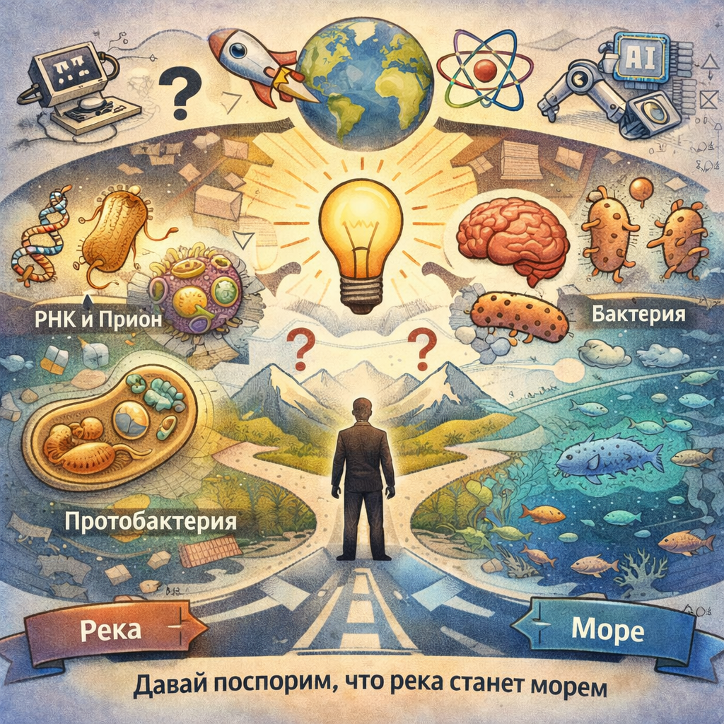 Мы начнем с того, что в данный момент говорит официальная наука, и посмотрим, где в ее построениях скрыты слабые места и неудобные вопросы. А затем отправимся в путешествие — от прионов, первых самовоспроизводящихся структур, через мир РНК к удивительной жизни бактерий, чтобы на этом пути найти ту точку, где химическая реакция превращается в осознанный выбор, а река жизни впадает в море сознания.