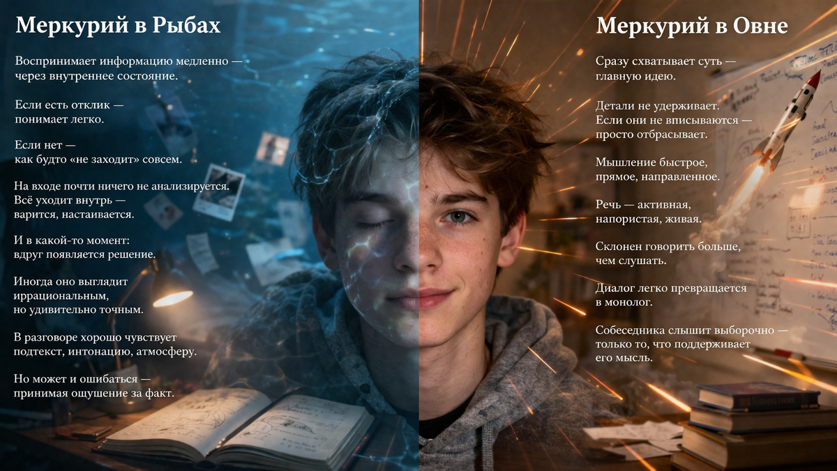 Информация не схватывается, не разбирается на части, не подвергается мгновенному анализу. Она, скорее, просачивается внутрь, как вода сквозь ткань. Человек с таким положением Меркурия не столько понимает, сколько настраивается.