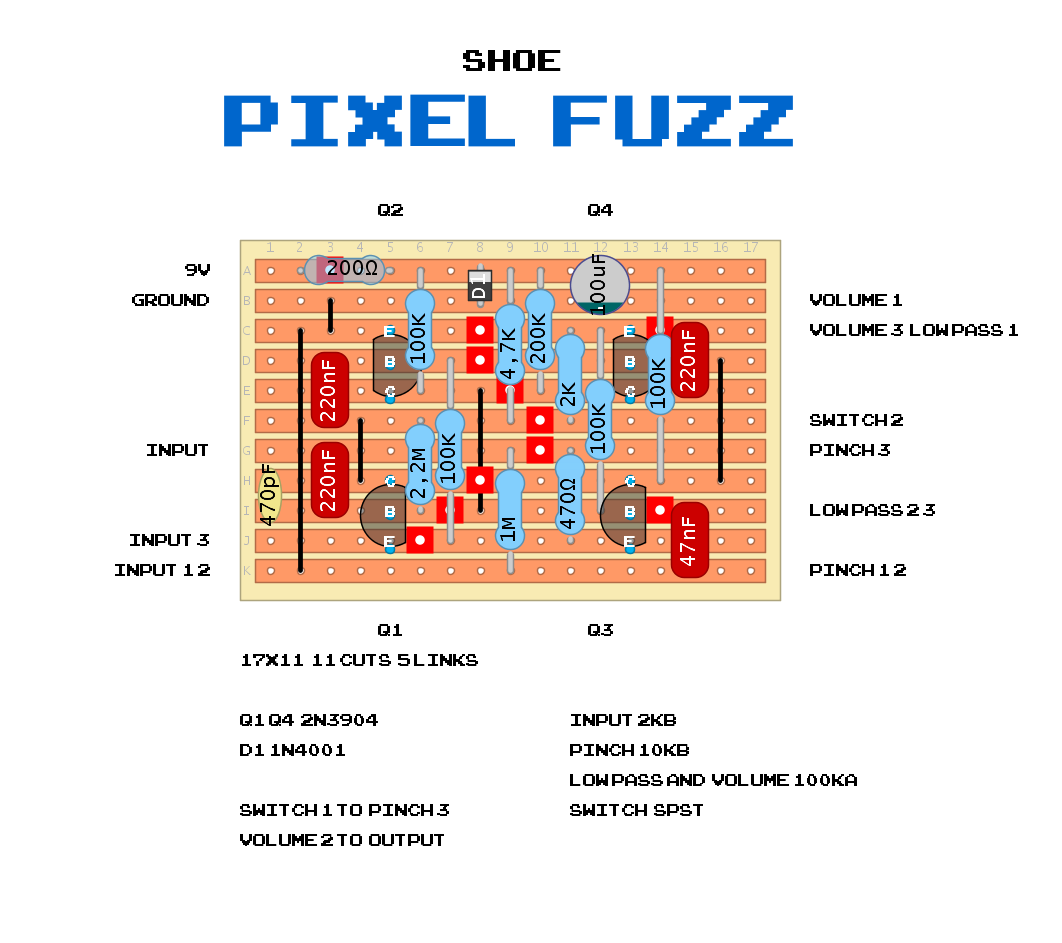 Судя по названию SHOE PIXEL FUZZ и характерным обозначениям на схеме, это вариация легендарной фузз-педали Death By Audio Absolute Destruction (она же — Harmonic Transformer) или её прямое клонирование/модификация от мастерской ShOE Pedals (вероятно, небольшой бутик-мастерской из США или DIY-проект).